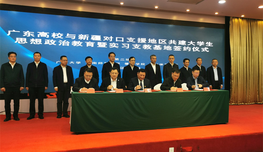 本网讯 3月26日,广东高校与新疆对口支援地区共建大学生思想政治教育暨实习支教基地(以下简称“校地共建”)签约仪式在新疆喀什举行。粤新两地领导出席签约仪式。永利官网党委副书记谢冠华,党委委员、组织部部长欧洪湛,教育科学学院党委副书记刘远君等参加活动。