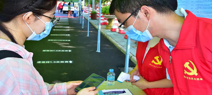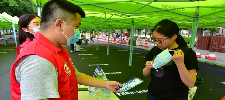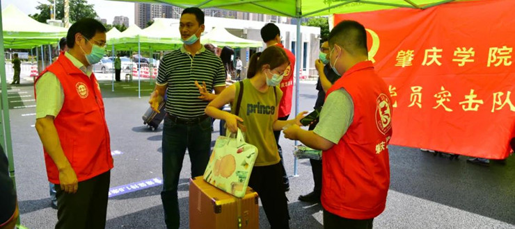 今天一大早,由机关党委志愿者组成的机关党员突击队已经在校门处守候,他们主要负责做好入校学子的粤康码查验、口罩更换等工作。早上7点多,就陆续有学子走进校园。他们从校门通道进入后,经过测量体温、出示学生证、粤康码,戴上志愿者为他们提供的新口罩,再经过后勤工作人员为随身物品行李进行消毒后,便可以回到宿舍区。