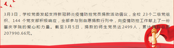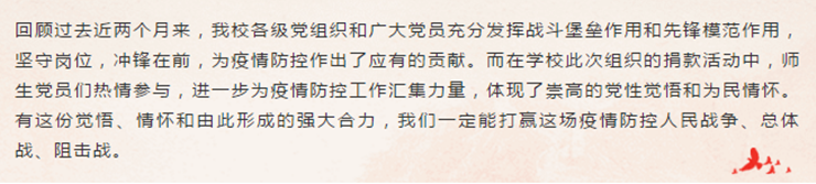 校党委书记曾桓松、校长吴业春带领校党委班子成员率先进行捐款。在这次疫情防控斗争中,校党委坚决贯彻习近平总书记的重要指示批示精神,全面落实中央、省委、市委的部署,以坚定信心、同舟共济、科学防治、精准施策为总要求,团结带领各单位、各部门开展全方位的疫情防控工作,切实维护了全校师生的健康和平安。校党委带头向疫情防控工作捐款,引领了全校上下共献爱心、共克时艰的行动。