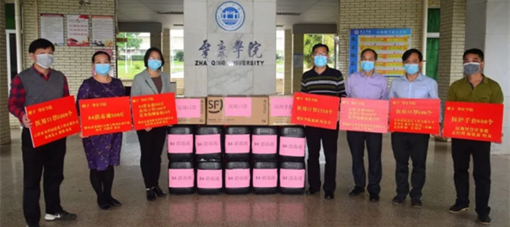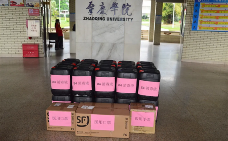 3月6日,佛山市汇丰旅行社有限公司总经理张昱校友专程回到母校,捐赠84除菌液250公斤、免洗抑菌洗手液120升等物资,助力母校抗疫。在简单的捐赠仪式上,她说:“母校培养了我,这个时候我应该为母校出一份力。”