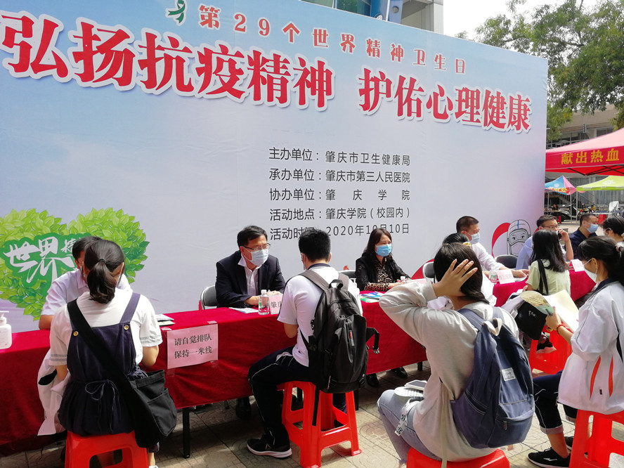 为深入贯彻落实党的十九大精神和习近平总书记在全国卫生与健康大会上的重要讲话精神,深化心理健康促进行动,永利官网作为协办单位,积极参加由肇庆市卫生健康局主办、肇庆市第三人民医院承办的 “世界精神卫生日”活动,在校园里弘扬抗疫精神,护佑心理健康,为青年学子健康成长提供指导和帮助。