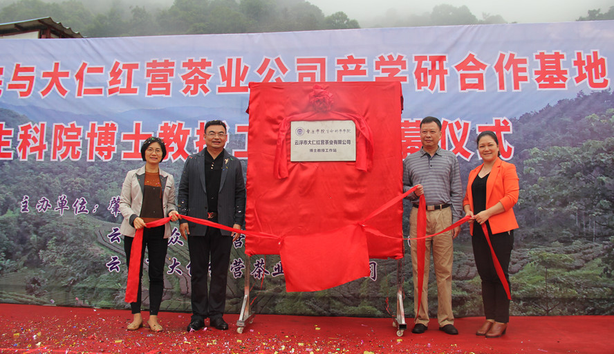 副校长李新昌,科技处、社科处、校地合作副处长杨琰,生命科学学院党委书记胡隼、副院长邵玲(主持行政全面工作)以及博士教授专家团队,云浮市、区、街道的相关部门领导,校友、大仁红营茶业有限公司董事长叶志奋参加挂牌仪式。
