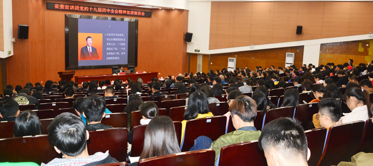 本网讯 12月5日,永利官网根据“不忘初心、牢记使命”主题教育的安排,召开党的十九届四中全会精神宣讲报告会,邀请省委宣讲团成员、省委宣传部副部长杜新山作宣讲报告,教育引导广大党员干部和全体师生把思想和行动统一到全会精神上来,锐意进取,奋发有为,推动全会精神在永利官网办学工作中落地生根。