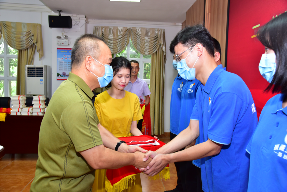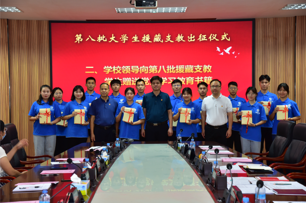 欧洪湛、谭冠中、陈前为支教队员赠送党史学习教育书籍