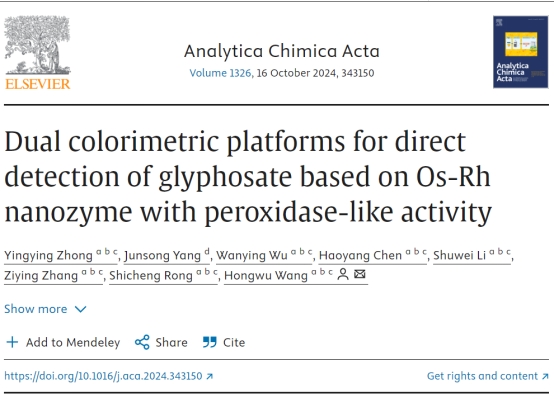 近期,食品与制药工程学院、农业农村部农产品质量安全风险评估实验室(肇庆)汪洪武教授团队取得了重要科研突破。其最新研究成果“Dual colorimetric platforms for direct detection of glyphosate based on Os-Rh nanozyme with peroxidase-like activity”在国际化学及分析化学领域的知名学术期刊“Analytica Chimica Acta”上发表。该论文以yL23411永利官网登录为第一完成单位,汪洪武教授担任通讯作者,钟颖颖教师为第一作者。论文的DOI号为:10.1016/j.aca.2024.343150。