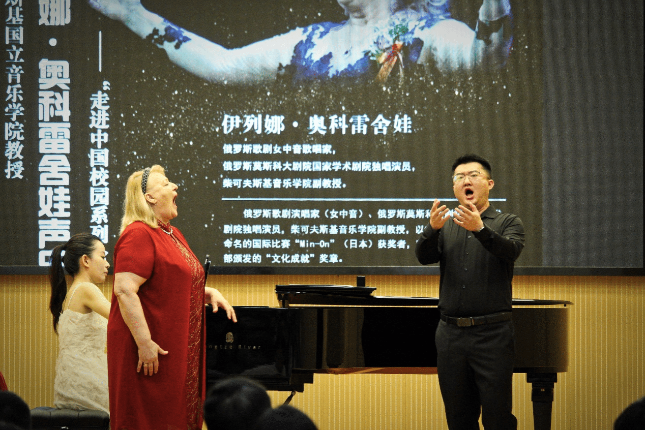 讲座中,伊列娜·奥科雷舍娃为音乐学院师生进行一对一的声乐指导教学,为大家讲授科学的发声方法、声乐训练模式及解决、分析作品处理等问题。现场,伊列娜·奥科雷舍娃还贴心、认真地对现场学生的提问进行答疑解惑。此次讲座,极大地提升了老师们的教学热情,促进了学生们对声乐的热爱、开拓了音乐学子的国际视野。