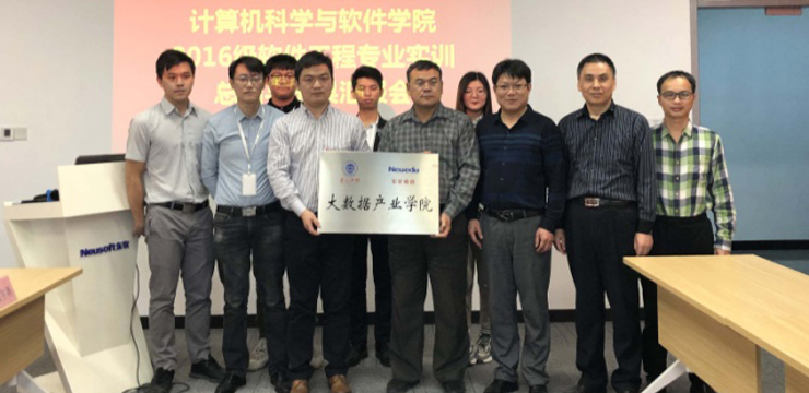 本网讯 近日,计算机学院组织开展“2016级软件工程专业东软睿道班毕业实习总结与成果汇报会”,并在合作企业举行“yL23411永利官网登录大数据产业学院”挂牌仪式。永利官网教务处、计算机学院有关负责人,东软睿道教育信息技术有限公司有关负责人共同参加。
