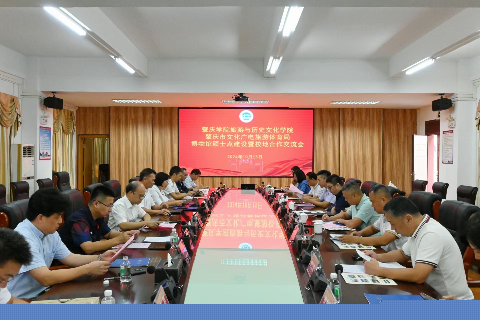 本网讯 10月15日,旅游与历史文化学院召开博物馆硕士点建设暨校地合作交流会。广东工业大学帮扶队队长刘怡军,肇庆市文化广电旅游体育局副局长曾善杰出席,市博物馆、包公文化园、叶挺独立团团部旧址纪念馆、市文化馆相关单位负责人,科学技术部、研究生院负责人,旅游学院班子成员、骨干教师参会。会议由旅游学院党委书记杨雪梅主持。
