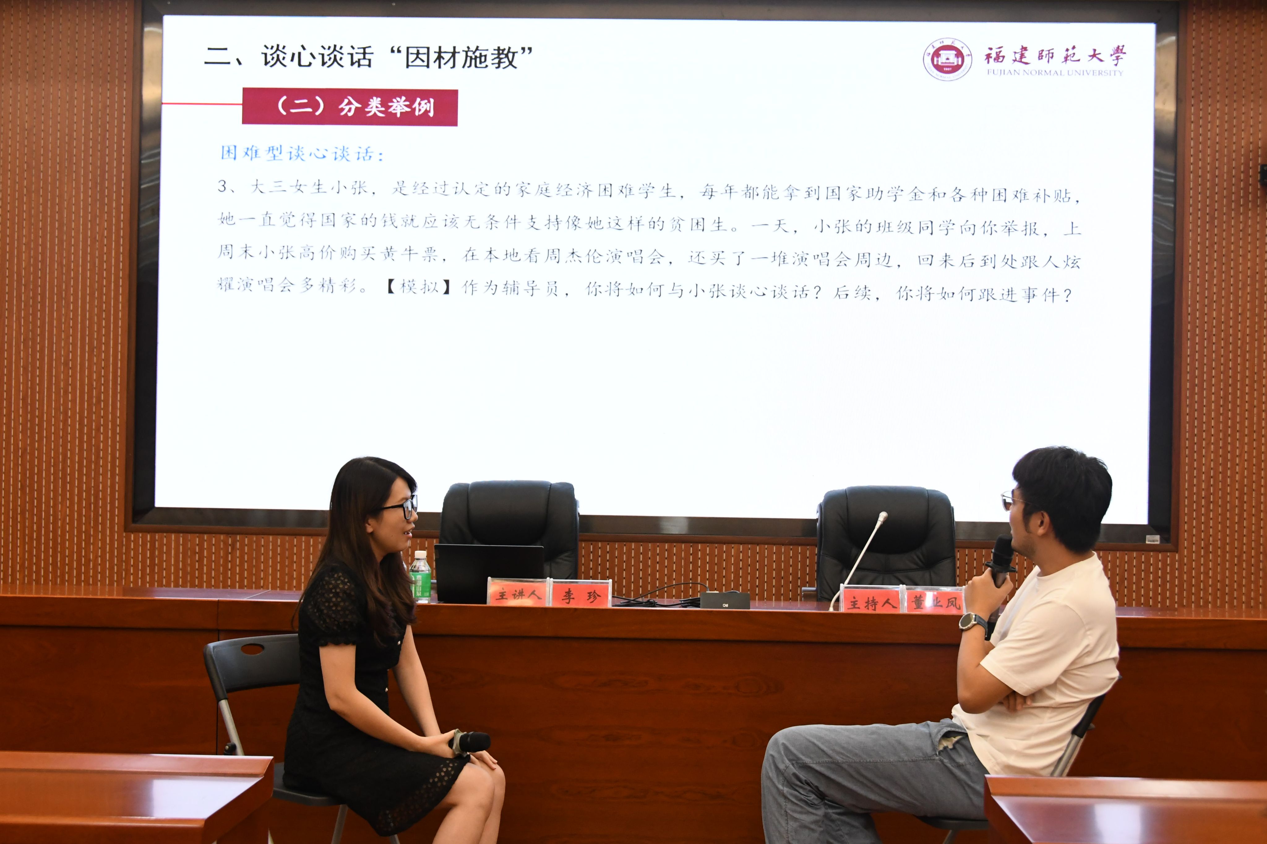 本网讯 11月15日,“yL23411永利官网登录2024年辅导员素质能力提升班”暨砚园学工课堂第四讲《学生工作中不同场景下谈心谈话的艺术与技巧》在行政楼第二会议室举行。讲座特邀福建师范大学辅导员、全国高校学习宣传党的二十大精神师生巡讲团成员、2022年全国高校辅导员素质能力大赛一等奖获得者李珍老师来校授课,学生工作部副部长董业凤主持,辅导员培训班全体成员参加。