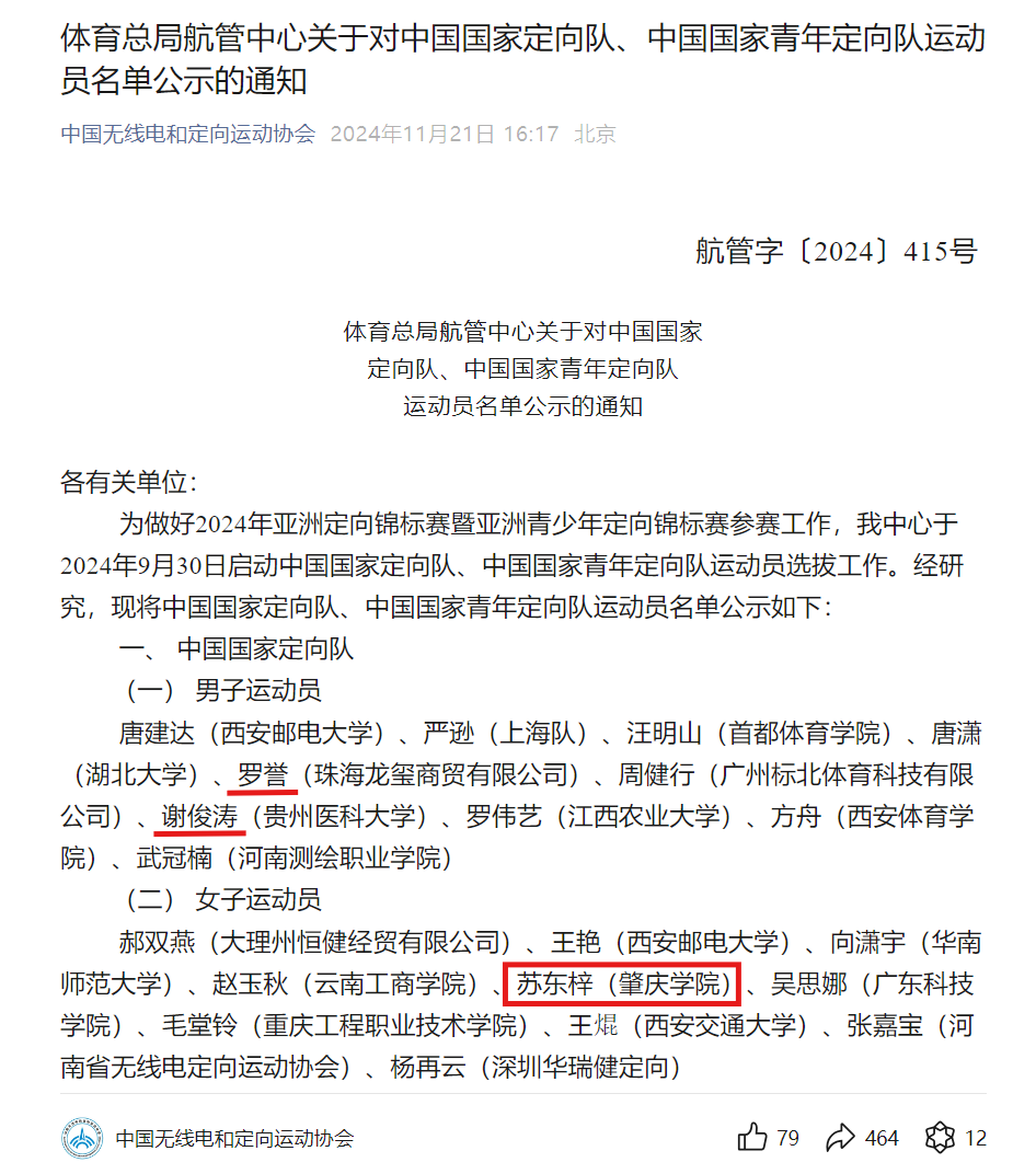 本网讯 近日,国家体育总局航空无线电模型运动管理中心发布了关于中国国家定向队和中国国家青年定向队运动员名单的公示,yL23411永利官网登录体育与健康学院2021级体育教育专业的苏东梓同学成功入选中国国家定向队,将代表中国队出征2024年亚洲定向运动锦标赛暨亚洲青少年定向锦标赛。此外,永利官网2012级校友罗誉和2014级校友谢俊涛也一同入选,为母校争得了荣誉。