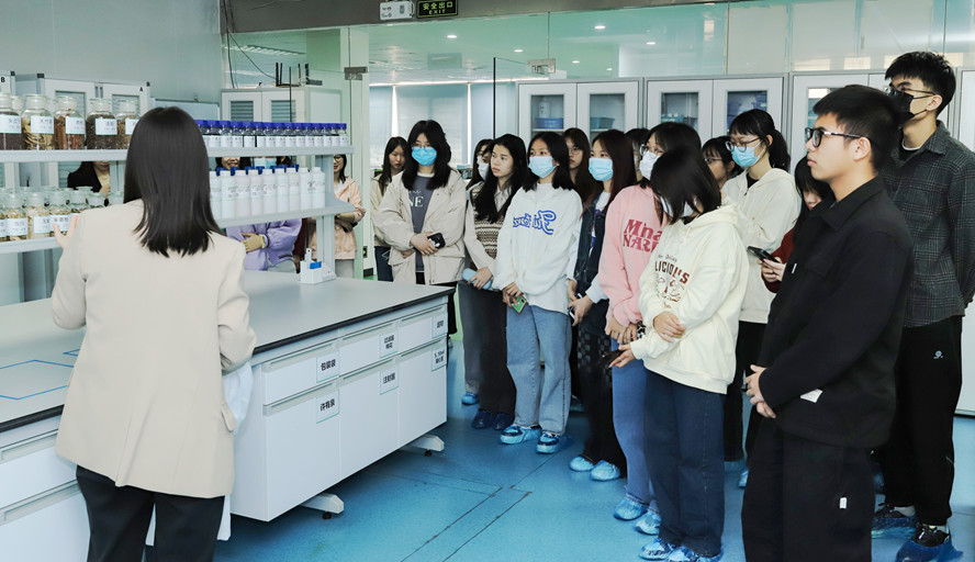 2020级化妆品技术与工程专业40余名学生在企业技术人员的带领下,分别参观了两家企业的生产车间、研发实验室级功效检验实验室等,对化妆品知识在实际中的应用,化妆品行业工作人员的工作精神都有了更深层次的认知。