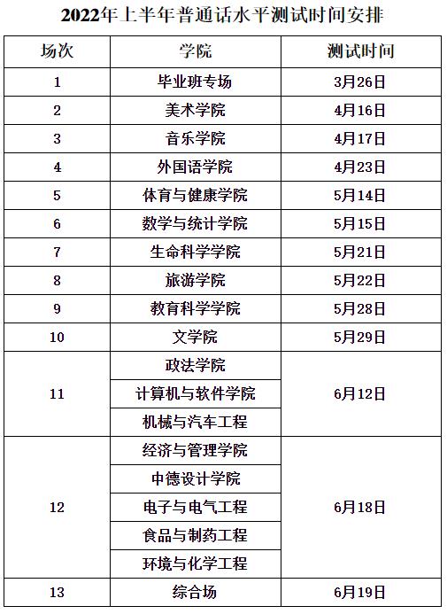 1.考试时间:2022年3月-6月 周六日(共13场),各学院测试场次及时间见附件1。
