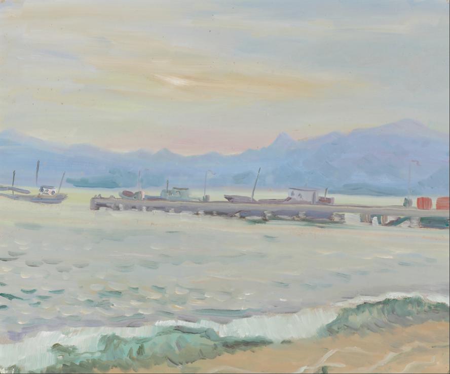 《水泥码头早霞·深圳盐田》 油画 38.5×31.3cm 1984年