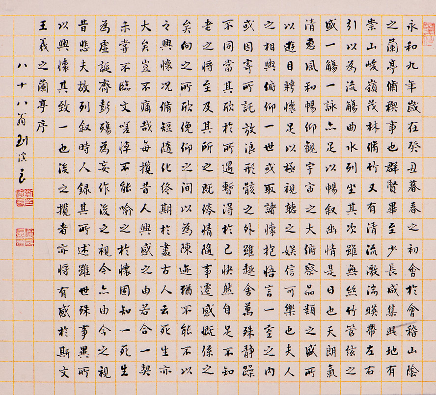 刘演良先生精善小楷,坚持日写数百字,九十高龄写蝇头小楷,手犹不抖。每以文徵明为榜样自勉,常笑言:“文衡山享年九十,八十八岁时尚能写精到小楷,我争取比他多写几年。”其小楷结体谨严,壮年时所写端庄丰腴,温润靓丽如有德君子;老年时所写平和内敛,人书俱老如得道智人。刘演良先生亦擅画山水、花鸟,尤以青绿山水最为得意。