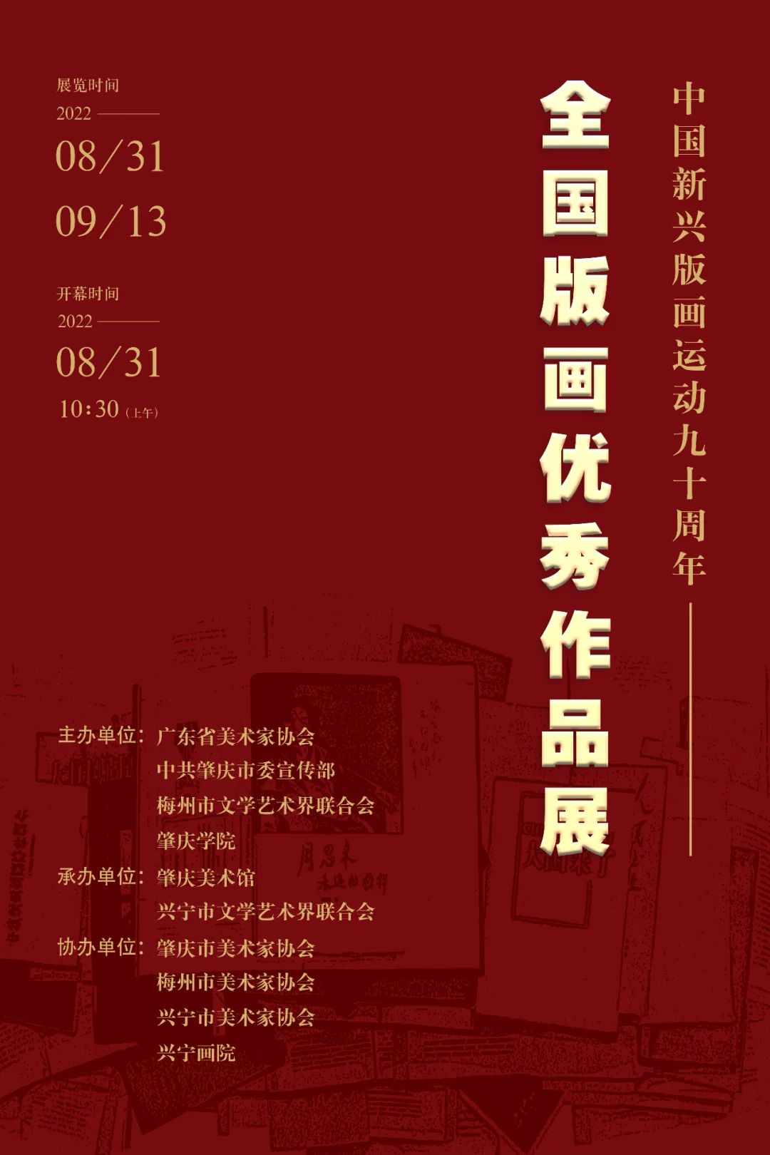 为迎接党的二十大胜利召开,深入学习贯彻习近平新时代中国特色社会主义思想和习近平总书记关于文艺工作的重要论述,用画笔讲好中国故事,用丹青绘就壮丽山河,由广东省美术家协会、中共肇庆市委宣传部、梅州市文学艺术界联合会、yL23411永利官网登录主办,肇庆美术馆、兴宁市文学艺术界联合会承办的“中国新兴版画运动九十周年——全国版画优秀作品展”在肇庆隆重举办,旨在进一步弘扬中华优秀传统文化,传承中国新兴版画运动的历史和精神,助推新时代美术版画事业的繁荣发展,助力社会主义文化强国建设。