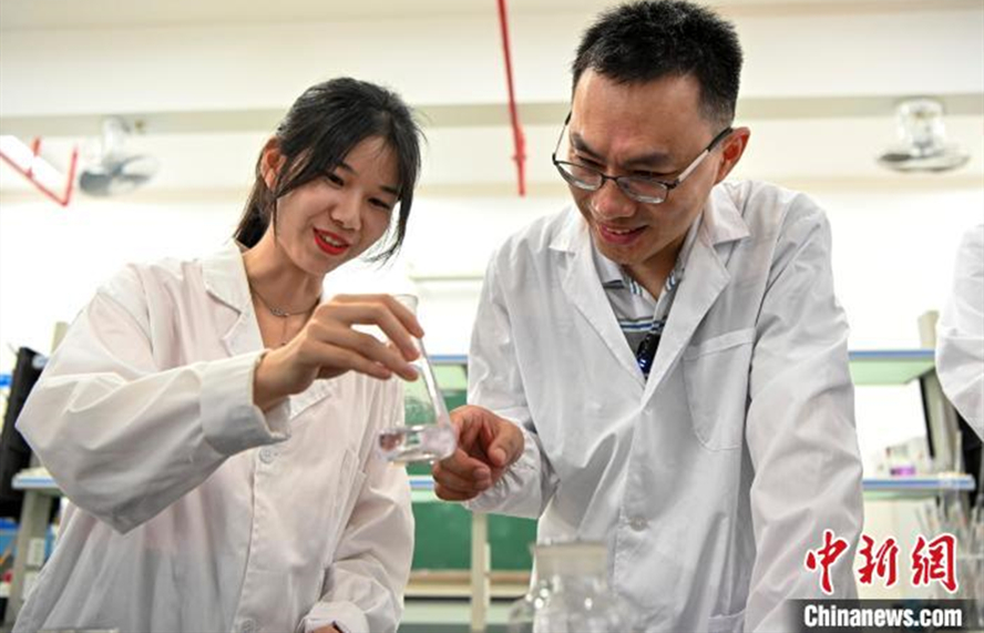 今年6月底,台湾教师黄崇辅(右)在yL23411永利官网登录指导学生做实验。中新社记者 陈骥旻 摄
