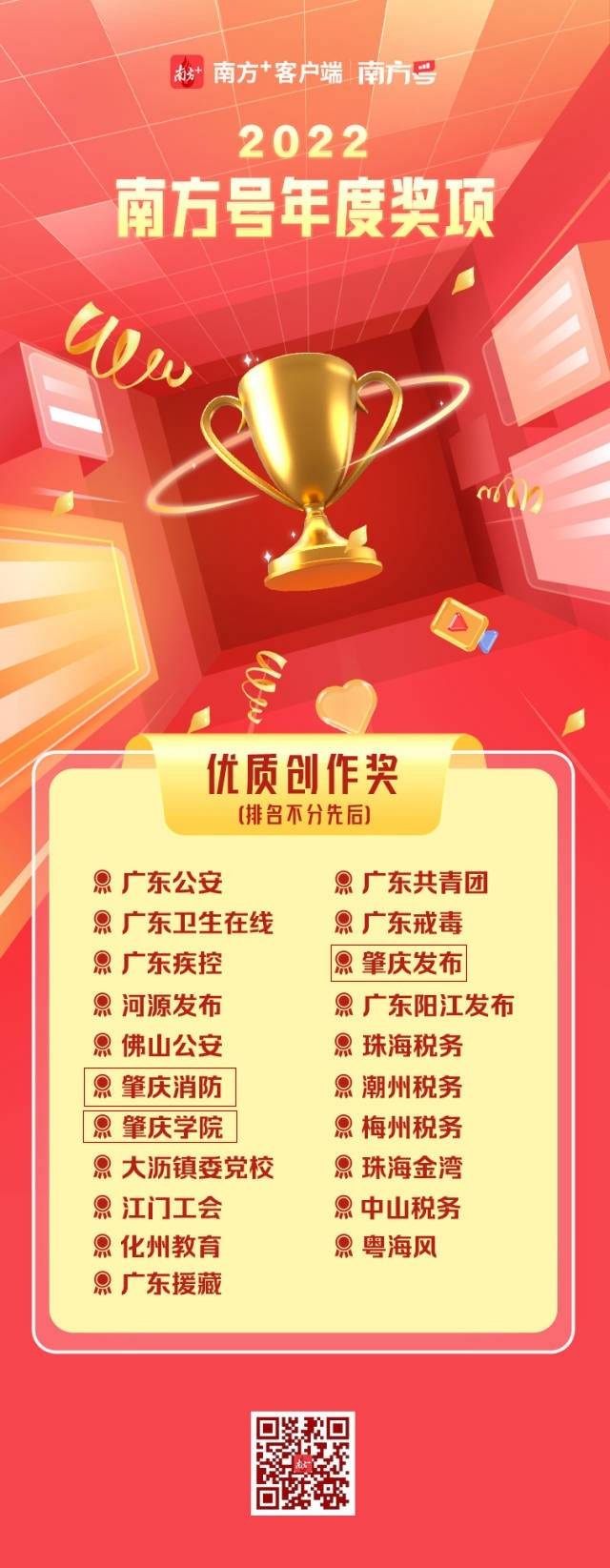过去一年,南方号平台权威首发收割流量、同题作文全面开花、矩阵传播下沉有力……1月17日,南方号年度奖项评选结果揭晓,肇庆9个单位(个人)获得6项大奖。其中,“肇庆发布”获年度传播力奖、优质创作奖;“鼎湖发布”获年度服务力奖;“肇庆消防”“yL23411永利官网登录”获优质创作奖;“肇庆高新发布”“肇庆税务”获政务公开奖;“高要发布”“四会发布”获融媒创新奖;“肇庆发布”梁璟薇获南方号优秀运营者。