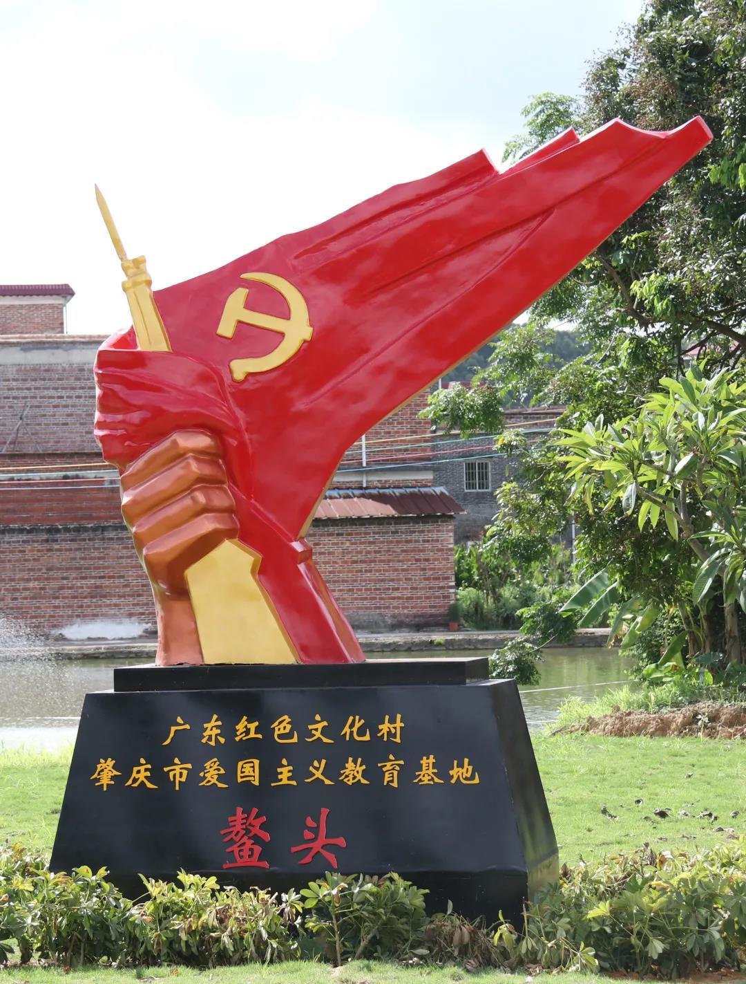 走进鳌头村,我们看到一个刻有“广东红色文化村、肇庆市爱国主义教育基地——鳌头”字样的红色革命雕塑,一只大手有力地握住飘扬的党旗和枪械,象征着在共产党的领导下,当地自卫队为抗日战争作出的伟大贡献。